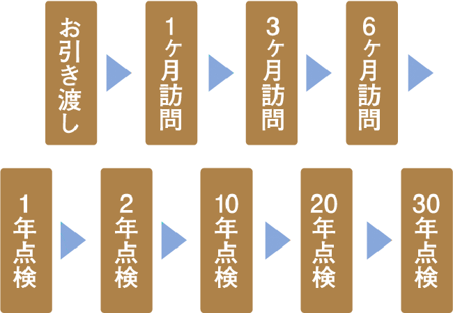 お引渡し後1ヶ月〜6ヶ月に担当者による3回の訪問点検、1年後〜10年後までに3回の定期点検を実施。 アフターサービスを通してのお客様との親密なお付き合いを継続いたします。 たとえば引渡しから1年後、及び最長保証期間満了までメーカーと共同で現状を調査し、万一、不具合が発生したときは速やかに対応を実施。 また保証期間後もご要望に応じて迅速に調査を行います。