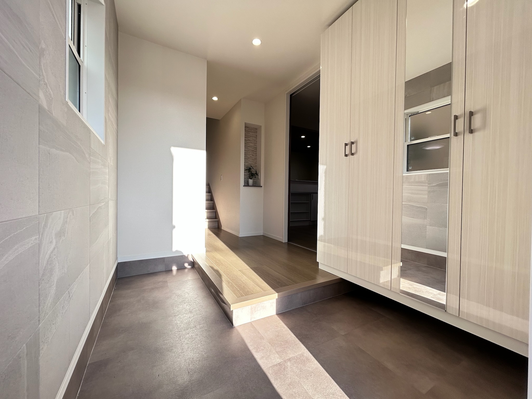 キッチンと洗面脱衣室をスムーズにつなぐウォークスルーパントリーを配置し、家事のしやすさを高めた回遊動線を実現。忙しい毎日をサポートする、効率的で快適な住まいです。